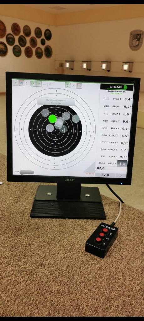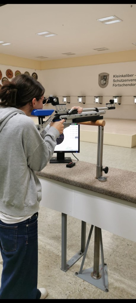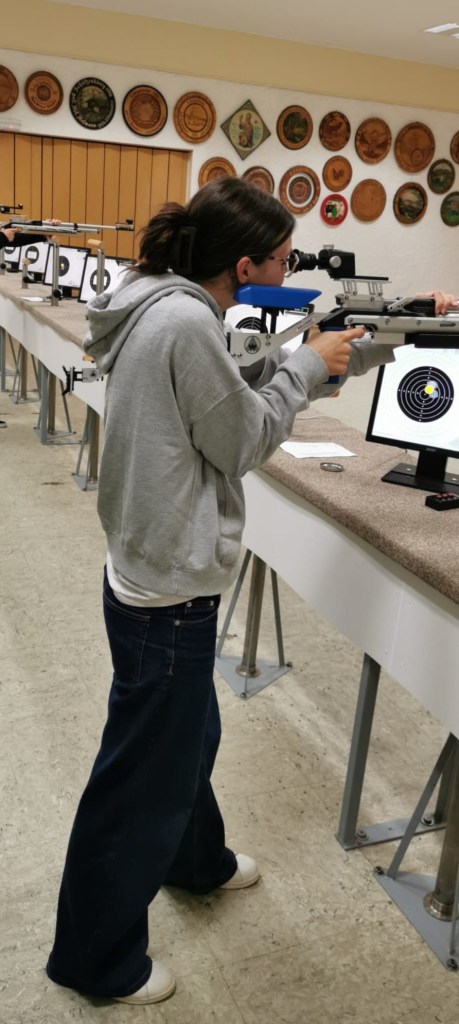 Vendredi soir, nous nous sommes rendus dans un bar qui a un stand de tir, dans le village. Nous avons participé à un concours de tir à la carabine. C’était super, j’ai adoré. J’ai fait 77 points sur 100 mais j’ai quand même fini à la 39e place sur 40 !!😂